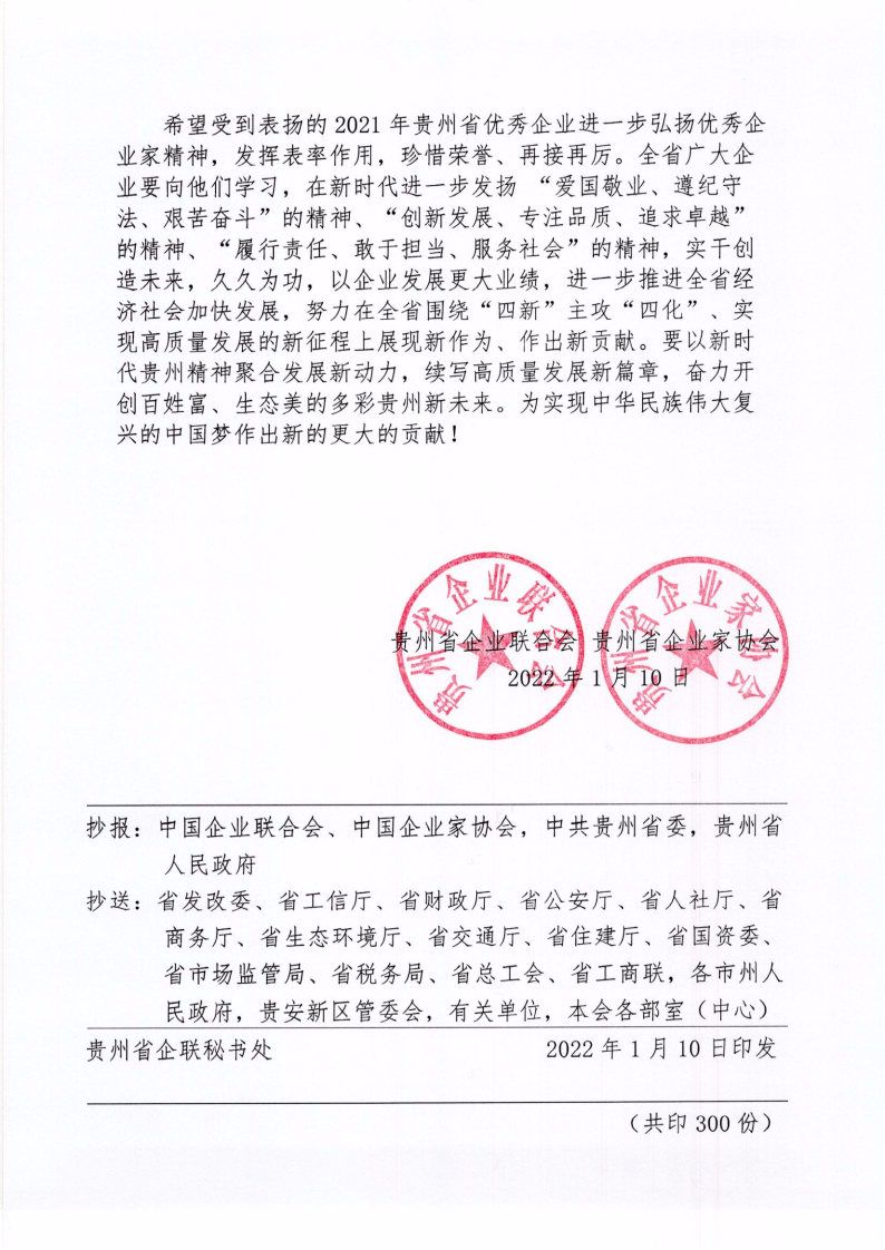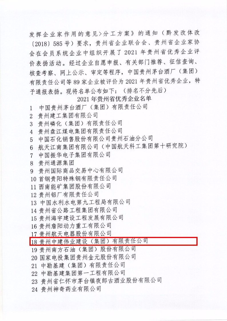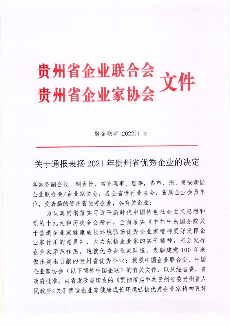 2022年1月10日,贵州省企业联合会、贵州省企业家协会印发《关于通报表扬2021年贵州省优秀企业的决定》,集团公司被授予“贵州省优秀企业”荣誉称呼。