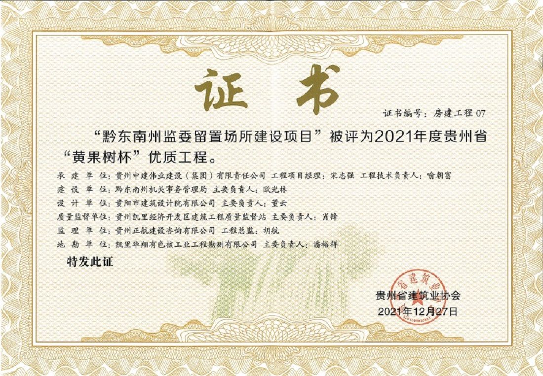 近日,从贵州省住房和城乡建设厅传来喜讯,公司承建的“黔东南州监委留置场合建设项目”荣获2021年度贵州省“黄果树杯”优质工程奖。
