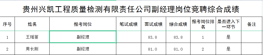 附件:贵州兴凯工程质量检测有限责任公司副经理岗位竞聘综合结果