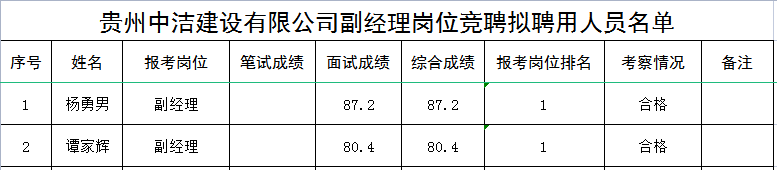凭据《贵州中洁建设有限公司副经理岗位竞聘实施计划》划定,经报名、资格审查、面试、考察等程序,现将拟聘用人员名单予以公示。